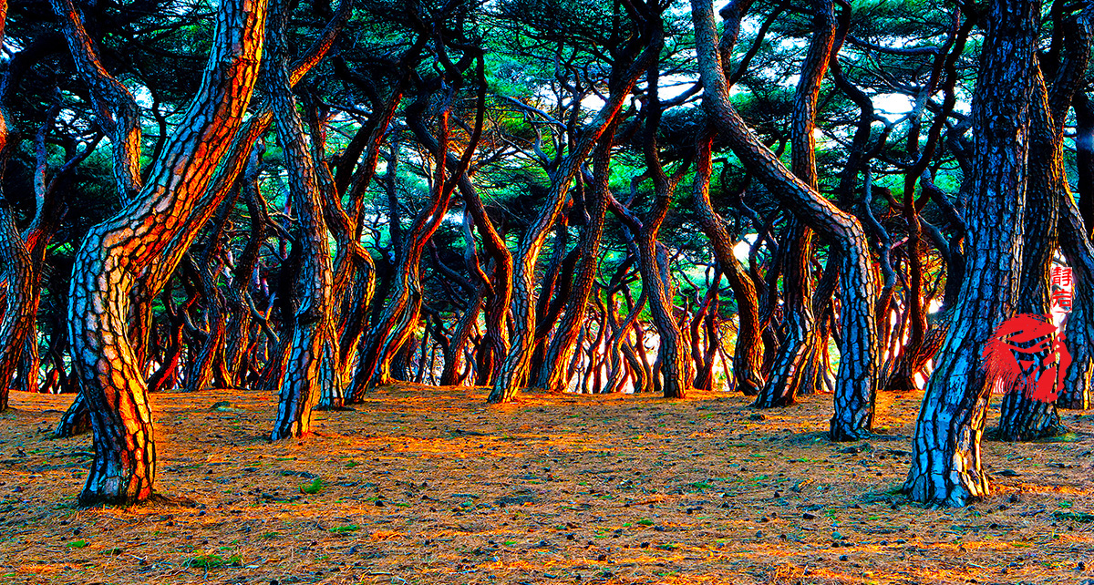 경주 흥덕왕릉의 천년 솔밭에 화려한 빛이 비추고 있습니다.