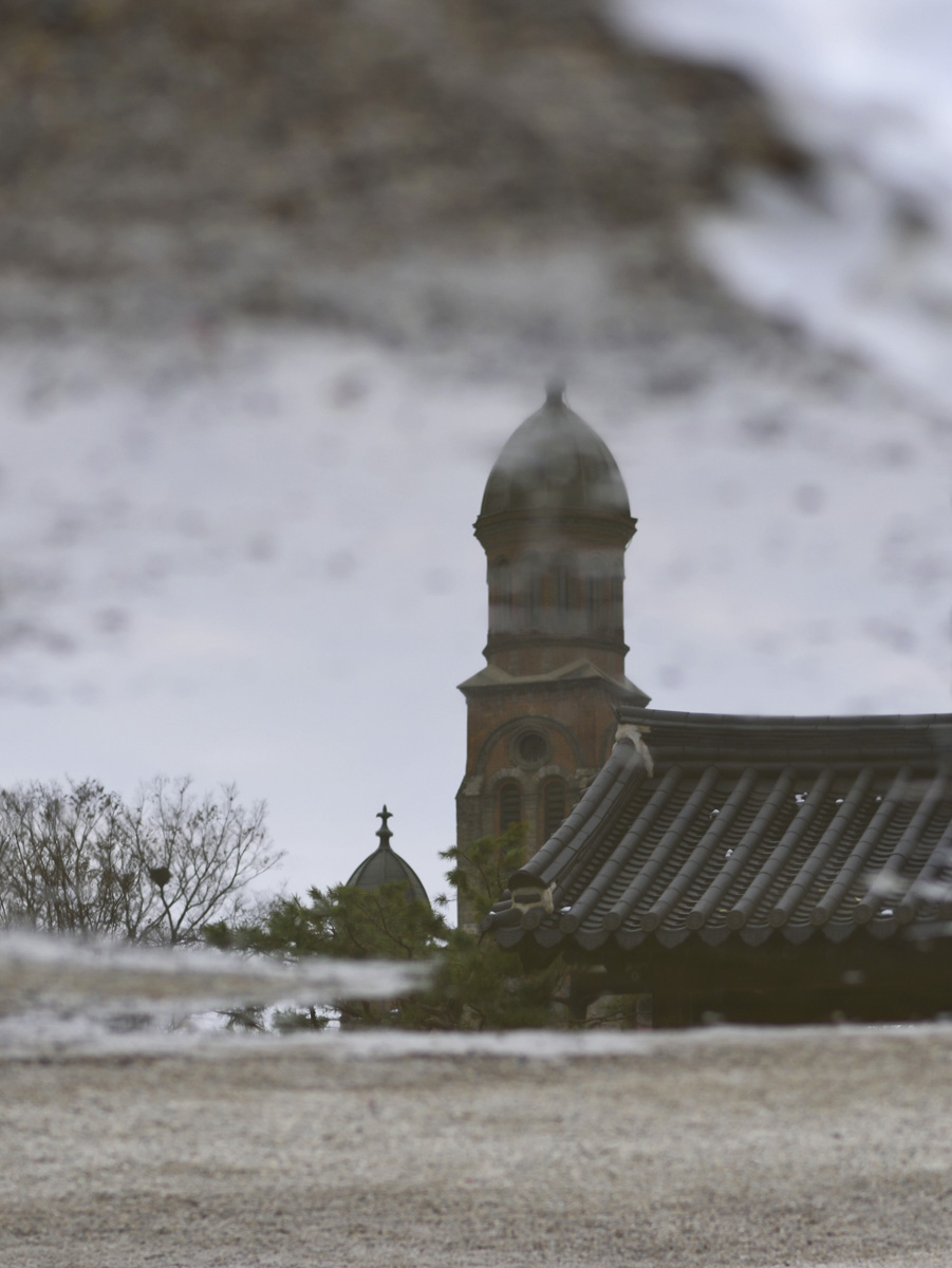 비춰진 한옥 기와와 명동 성당입니다