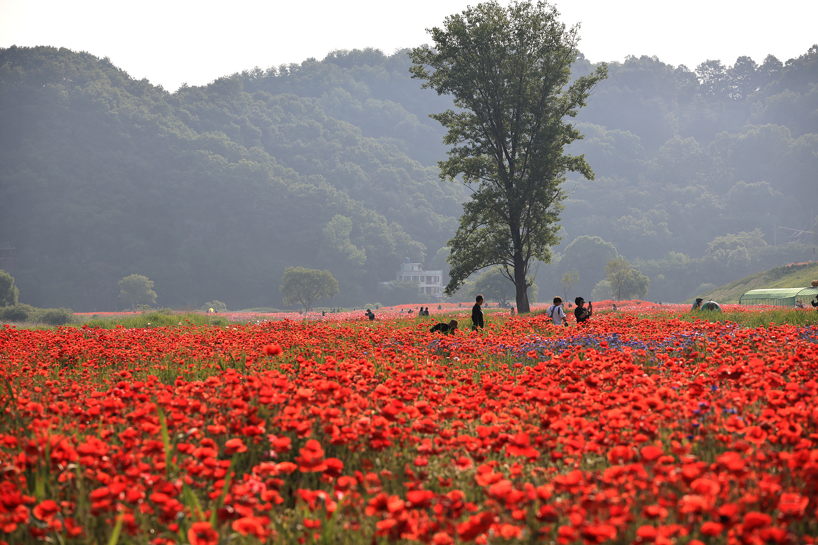 꽃양귀비 가득한 한가운데 홀로 서있는 나무