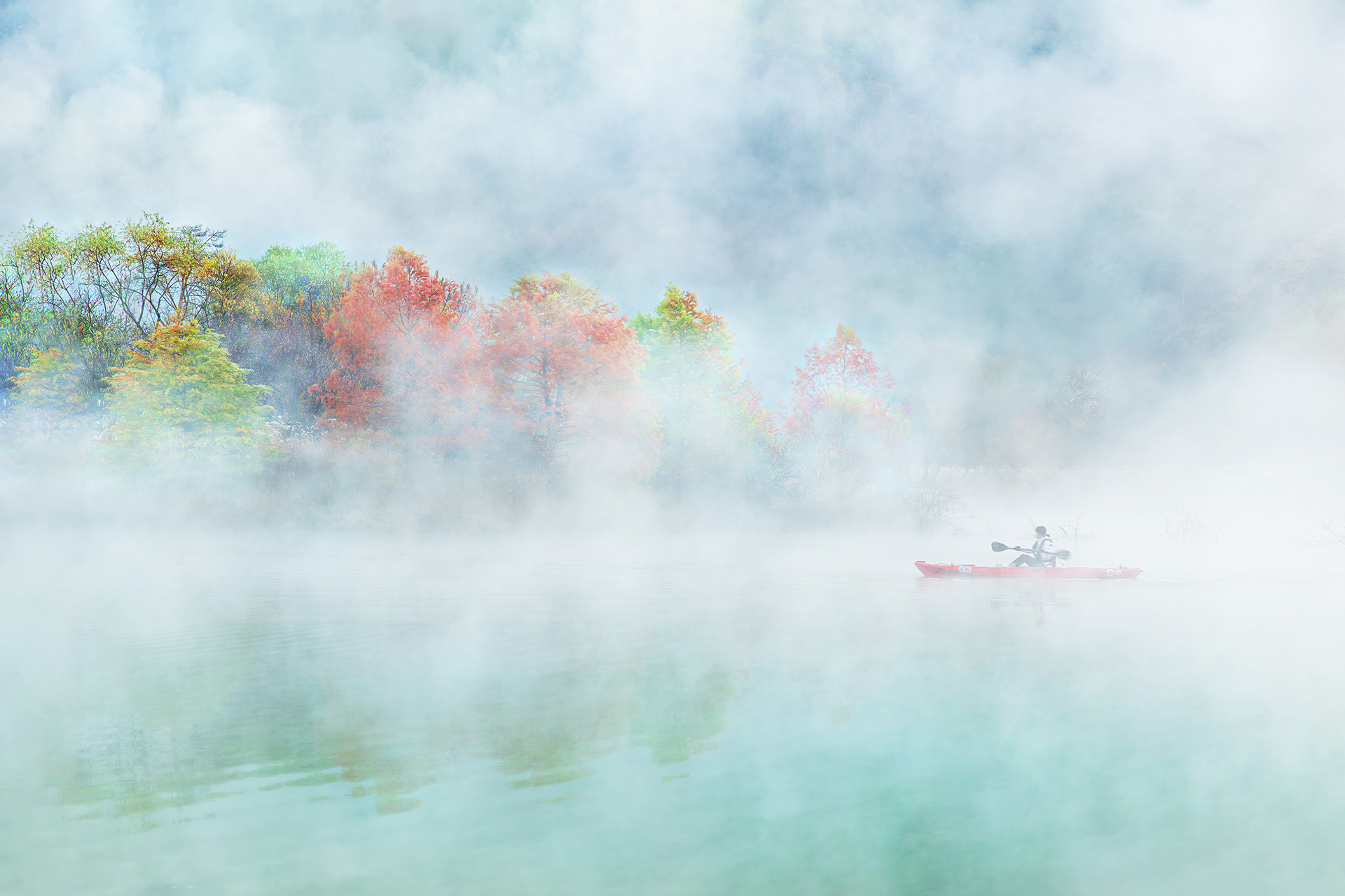 작가님들 만나서 반가웠습니다. 올가을 주천 생태공원에 세 번째 간 날 때마침 영화 촬영을 하고 있어 장소의 제약을 받았습니다. 한정된 곳에서 담다 보니 다소 불편이 따랐지만 그로 인해 촬영하는 장면을 담을 수 있는 잇점도 있었습니다. 꿈길인가 싶을 정도로 물안개가 풍성한 호수에서 여배우가 노를 저어가는 모습은, 마치 우리가 막연히 꿈꾸는 이상향을 향해 가고 있는 듯한 착각을 불러 일으키기에 부족함이 없었습니다.