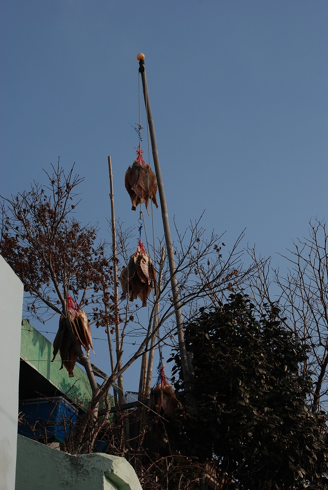 장대에 걸린 생선 야옹이도 못 건드려요.
