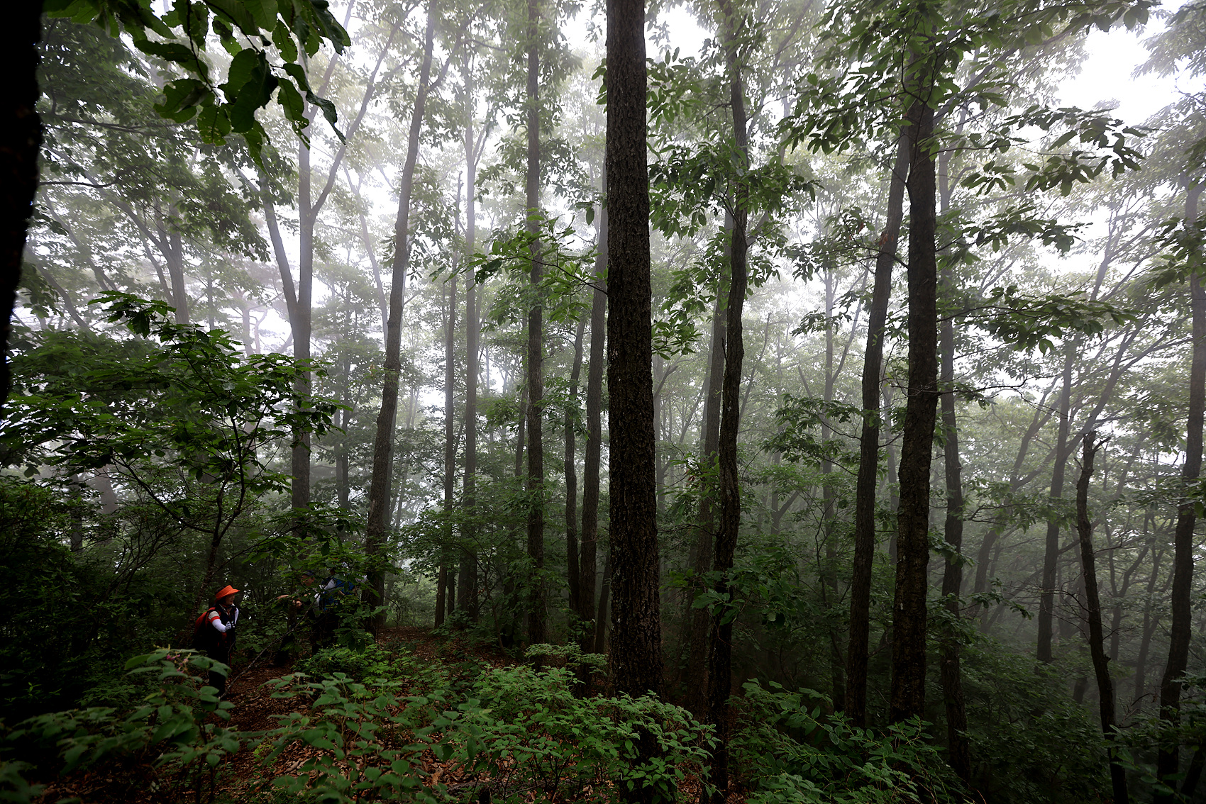 산속 깊은곳에 나무 사이로 구름이 낀 풍경 입니다