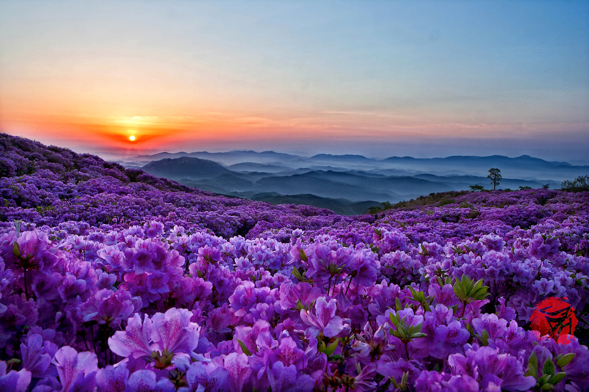 아침에 떠오르는 태양빛을 받아 더 아름다운 철쭉