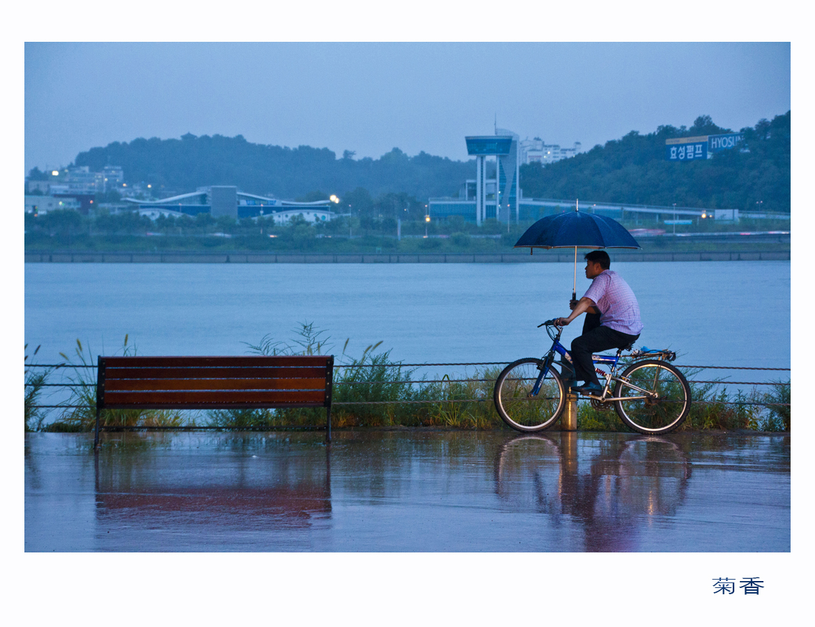 비 내리고 있는 한강을 하염없이 바라보고 있는 자전거 탄 아저씨 무슨 생각에 잠기어 하염없이 바라보고 있을까요?