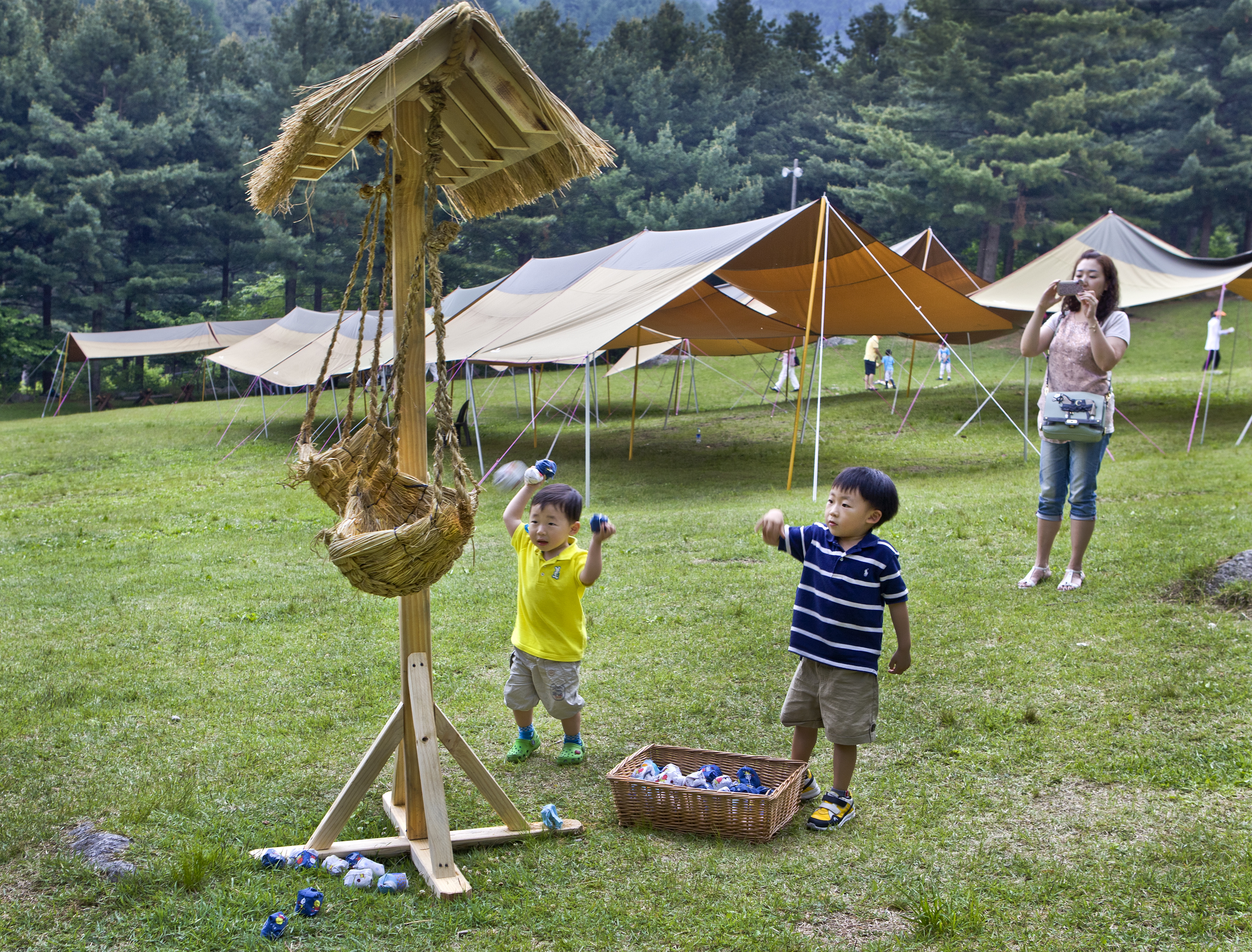 애기들이 모래주머니를 던지느라 바쁘고