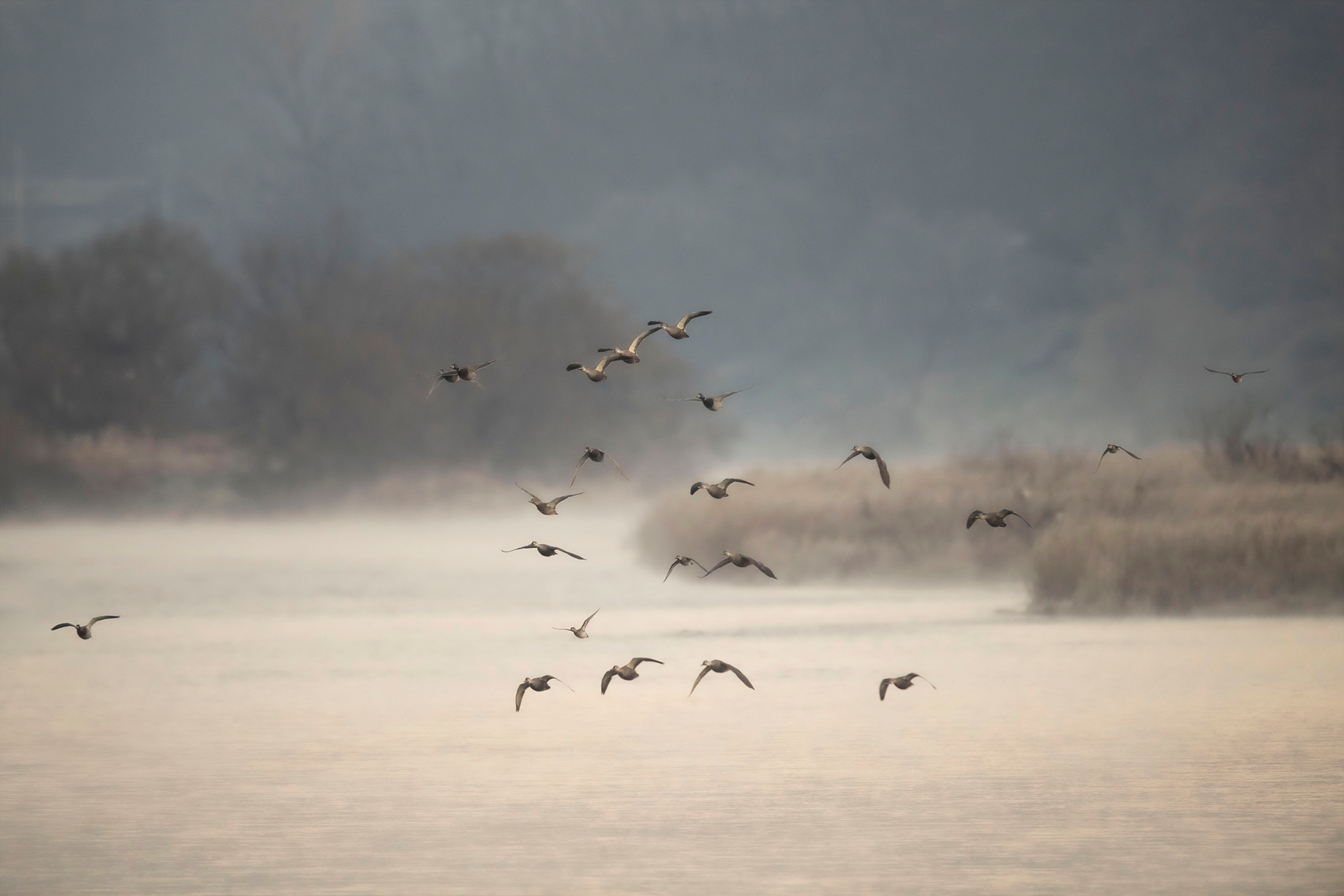 새벽녘 물안개를 벗삼아 금강을 날으는 기러기들의 모습!