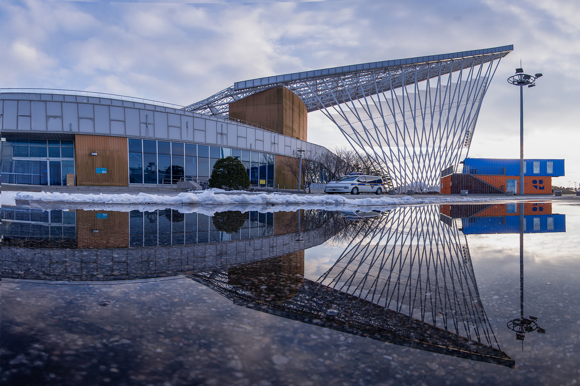 바닥에 눈을 치워 한쪽에 쌓인 그곳에 물이 고여 있었다.