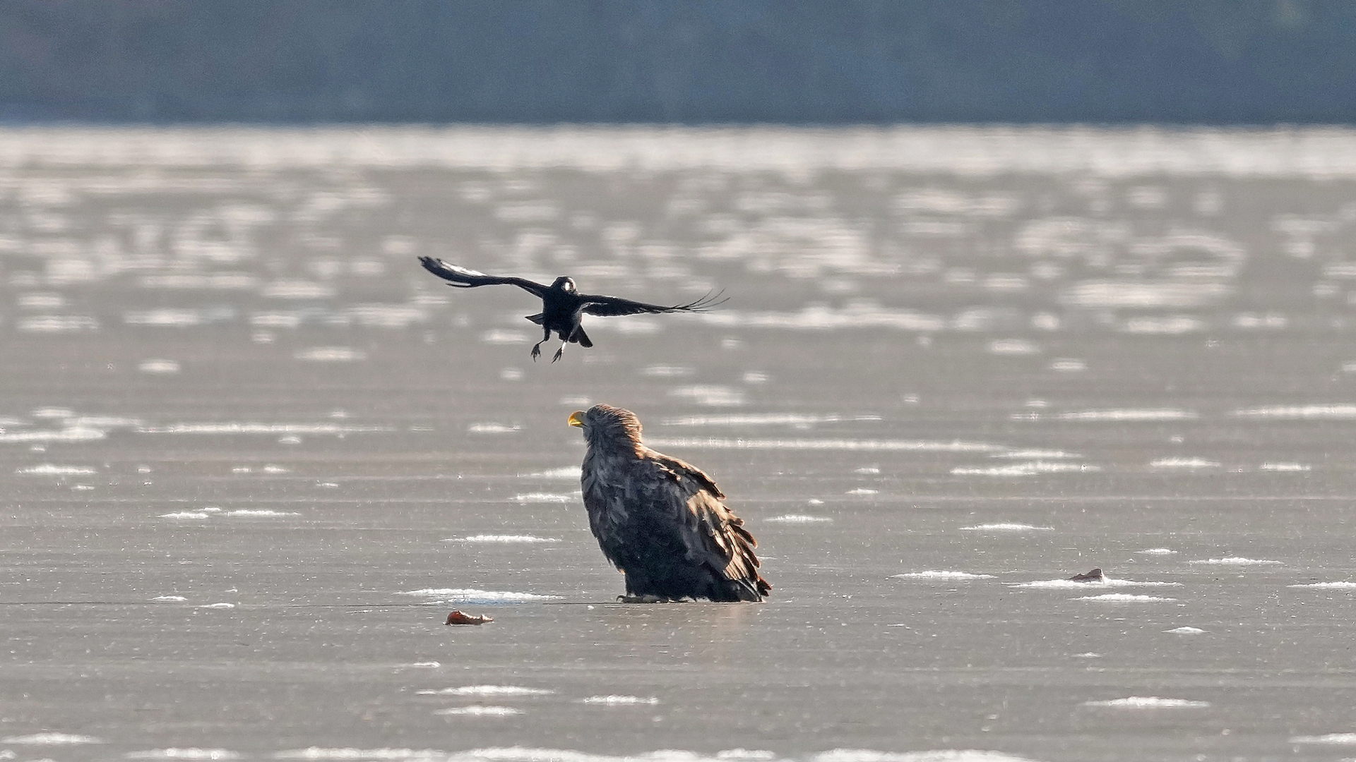 흰꼬리수리와 까마귀의 대치 상황. .