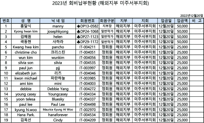 [알림] 해외지부 미주서부지회 2023년도 연회비 납부내역