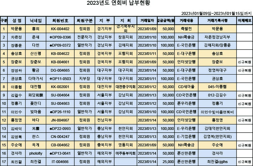[알림] 2023년도 연회비 납부내역(2023년01월09일~2023년01월15일까지)