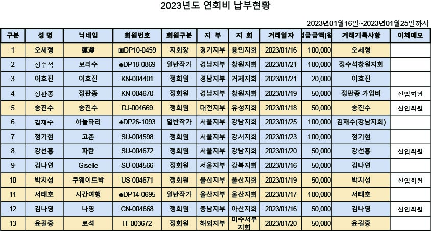 [알림] 2023년도 연회비 납부내역(2023년01월09일~2023년01월15일까지)