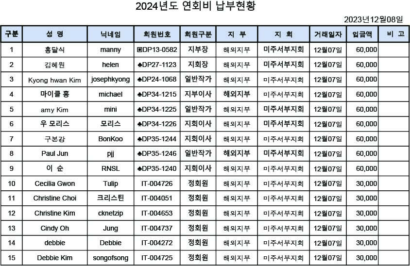 [알림] 2024년도 연회비 납부내역(2023년11월27일~2023년12월03일까지)