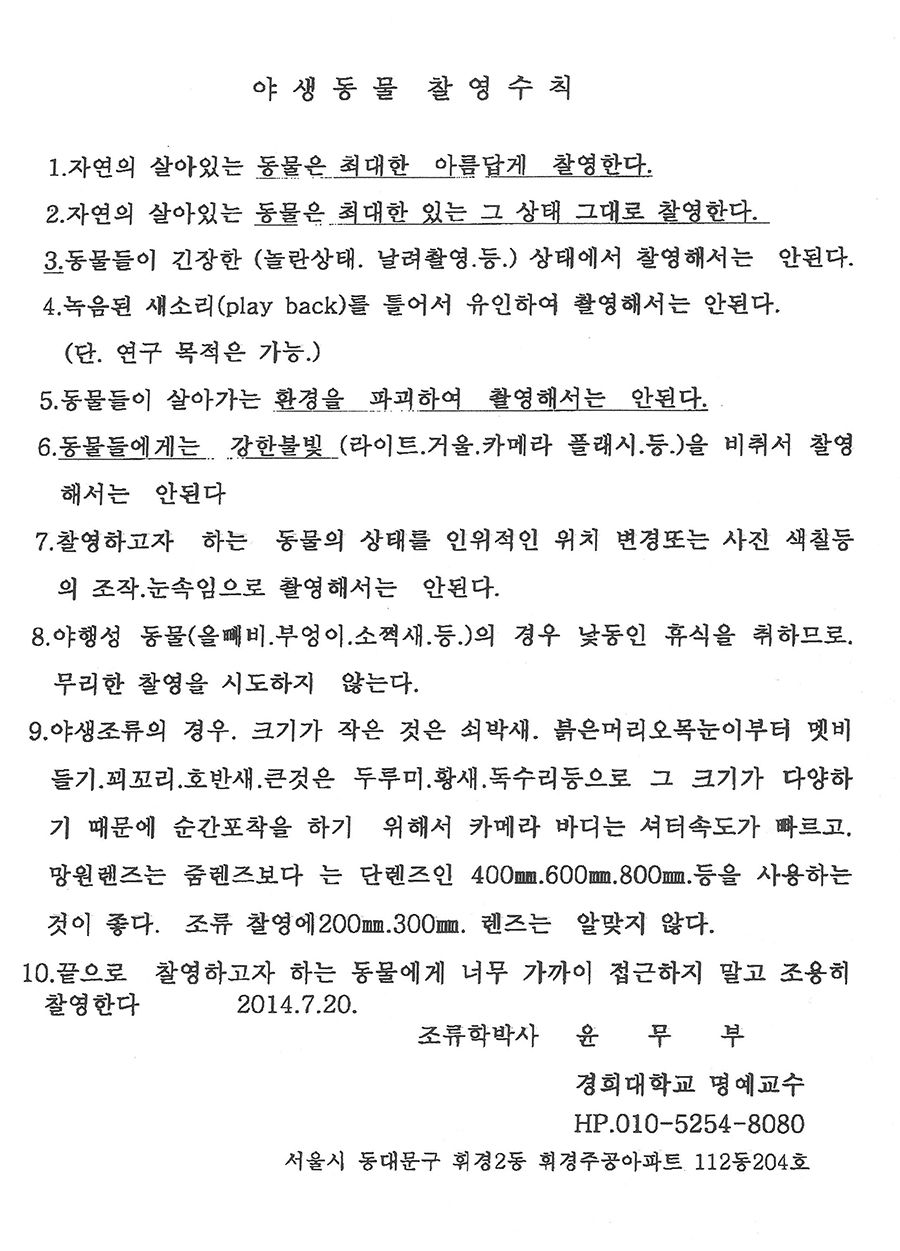 금일 협회로 야생동물 촬영에 대한 수칙이 담긴 한장의 Fax.와 함께 간단한 내용의 전화 한통이 왔습니다. 다름아닌 우리 사진가들이