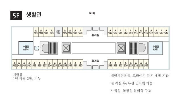 생활관 5층 A501호 ~537호, 생활관 3층 A303(숙소 배치 게시글 클릭 참조)