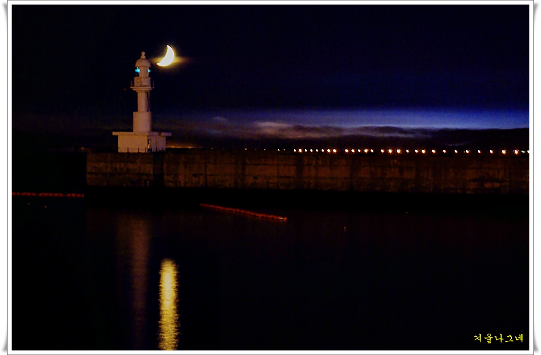 월미도에서 바라본 등대에 달이 걸려있는 야경입니다.
