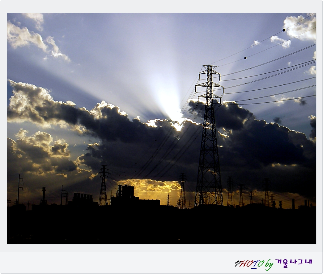 인공의 전력탑과 일몰 태양빛이 함께하는 장면입니다..