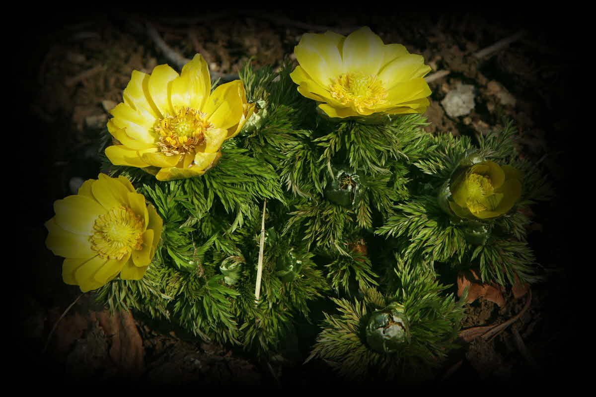 남넠의 어느 산자락에서 피어나고 있는 복수초 형제들...