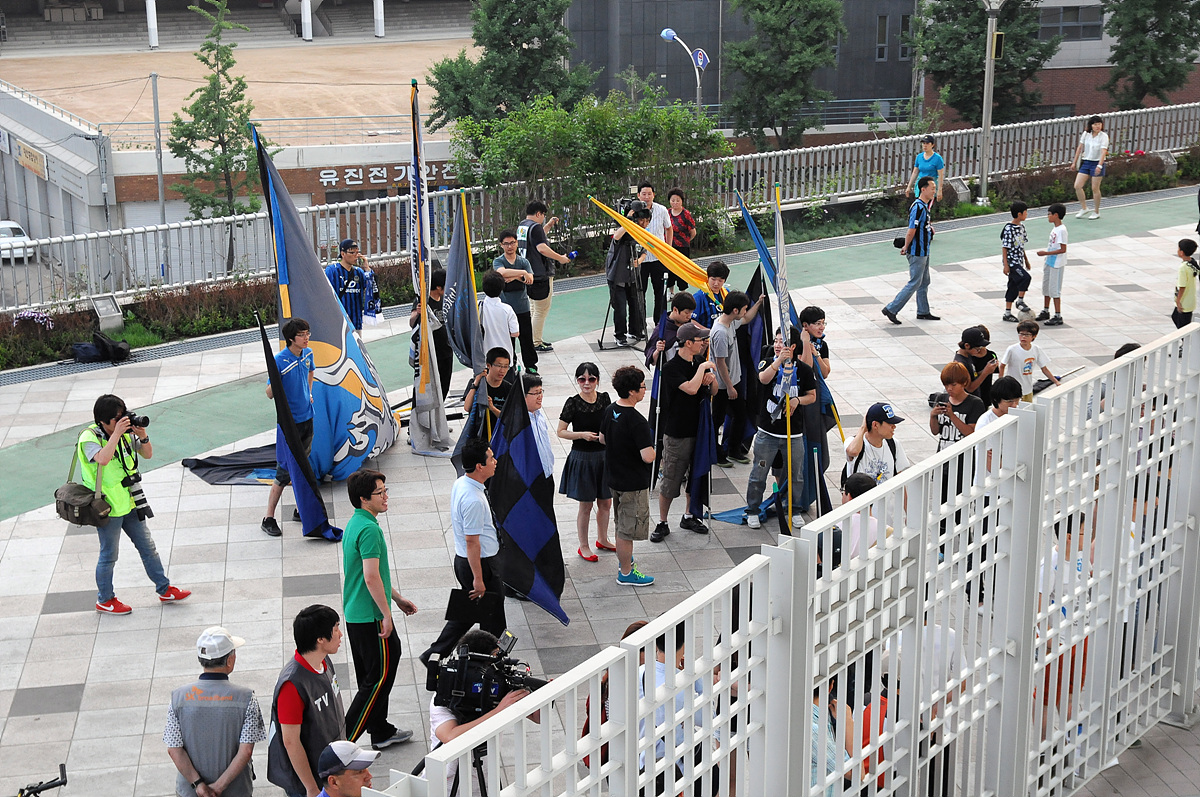 그러나 스탠드는 텅 비어 있었지만 인천 팬들은 경기장 철문 밖에서 반성의 의미로 청소를 하고 응원가를 부르며 인천을 응원했습니다.