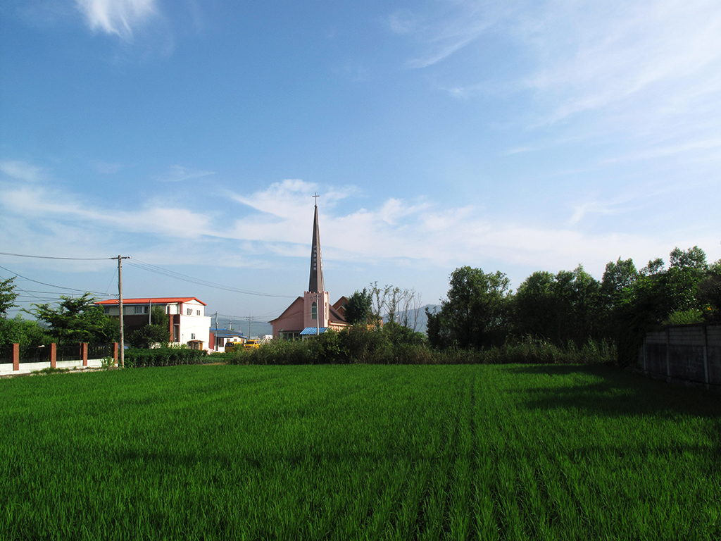 또한 논 한가운데 멀리 보이는 교회의 종탑