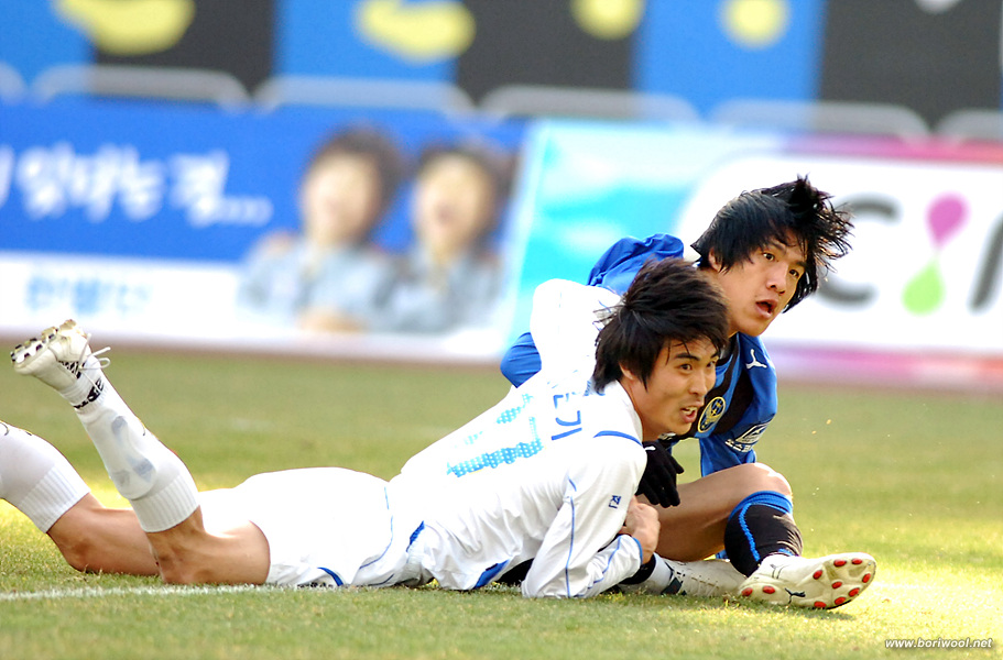 슛을 한 선수와 수비를 한 선수가 골이 되었는지를 확인하기 위해 골대를 응시하는 모습...