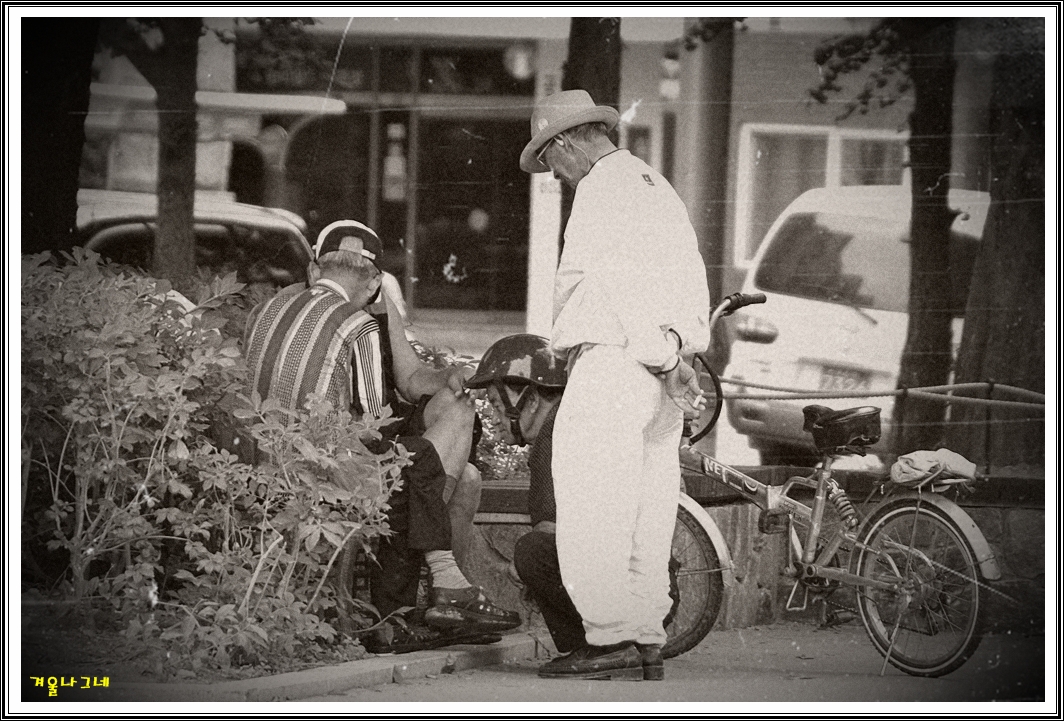 공원에서 두분이 장기를 두시는데 한분이 오토바이 핼멧도 안 벗으시고 구경을 하시고,  한참 후에 흰옷을 입고 자전거를 타신 할아버님이 또 오시더니 아에 쬬그리고 자리에 앉아 구경을 하시는 장면이 훈훈한 우리네 마음인것 같네요