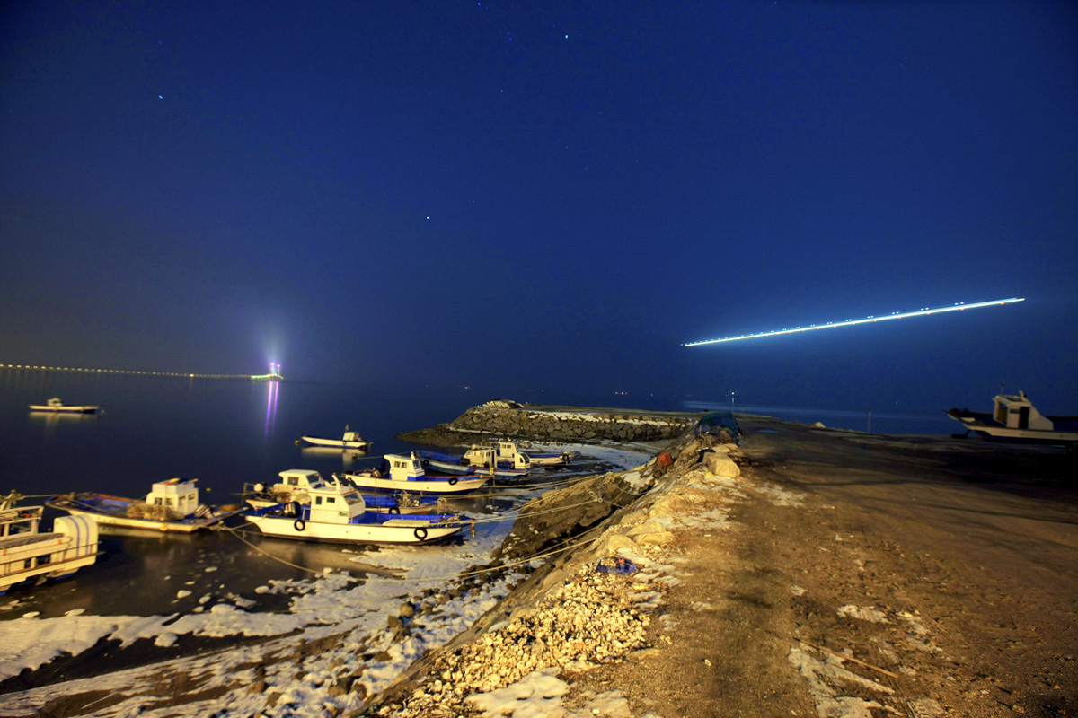 달밤애 인천대교와 비행기 괘적을 담다