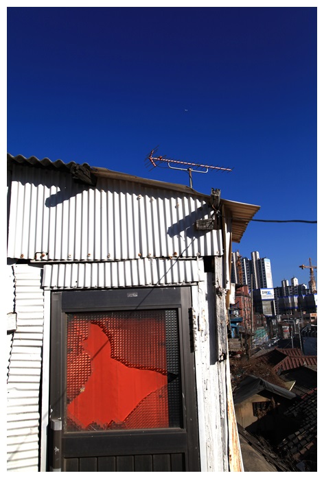 현관의 유리는 깨어져 버렸고, 이미 비어있는 집.. 저 건너에선 개발이 한창이다.