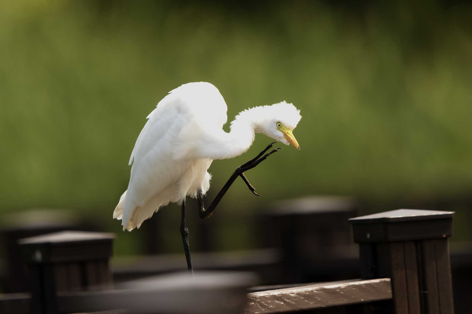 테크에 앉아 몸단장하는 백로를 담아봤습니다