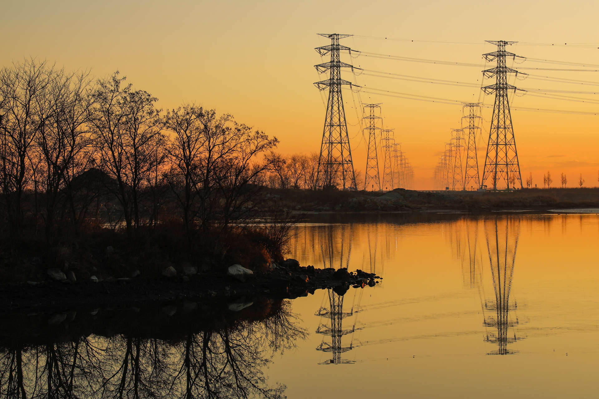 날이 밝아도 송전탑에 걸린 전기줄은 전기를 열심히 나릅니다.