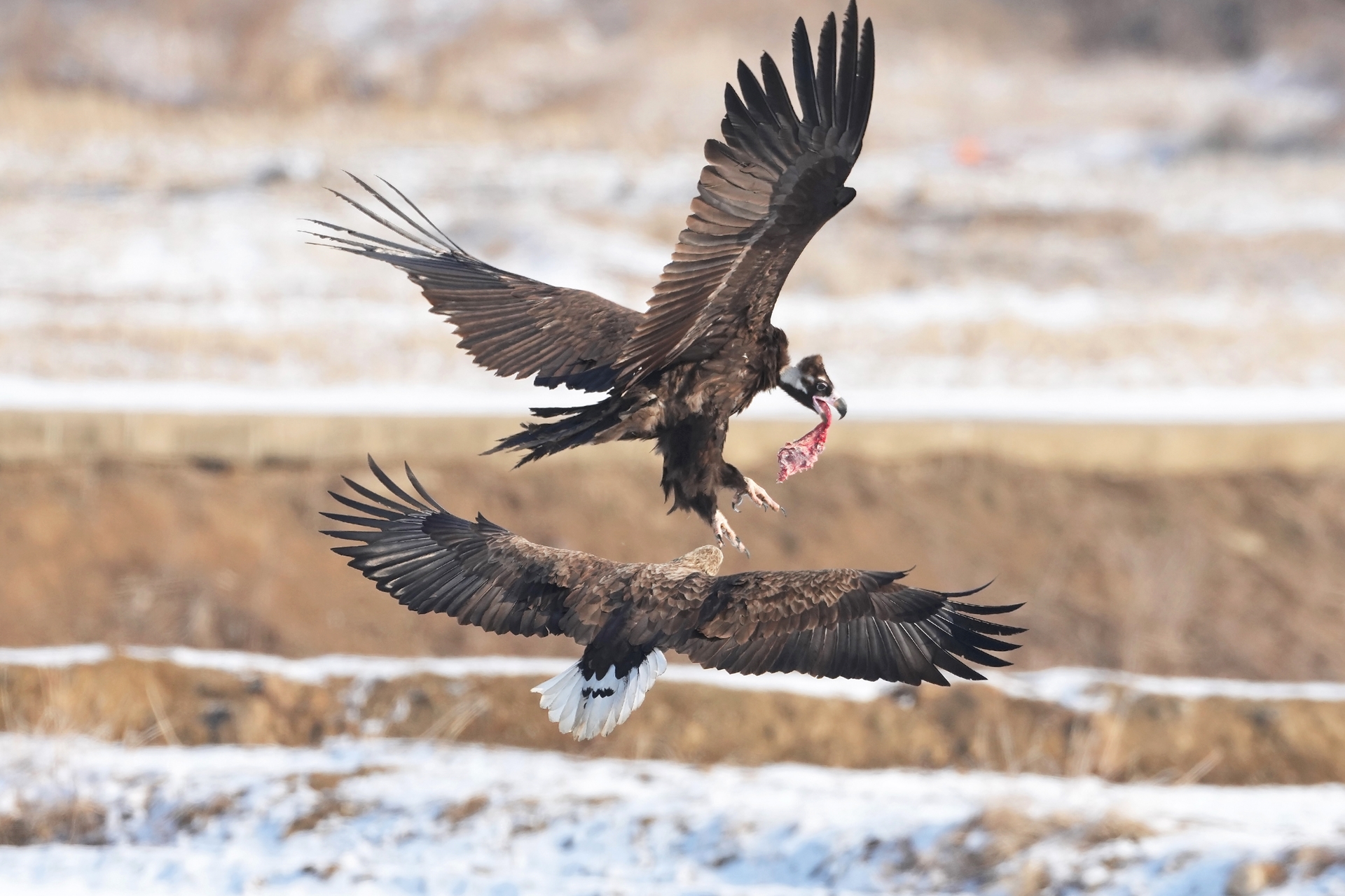 독수리의 먹이를 빼았으려 달려드는 흰꼬리수리가 용감하다...
