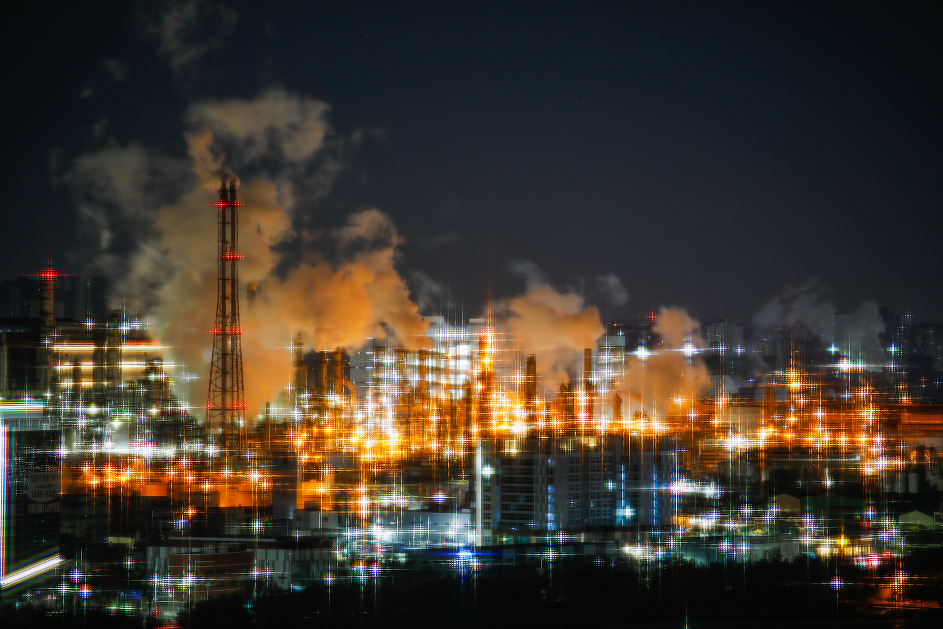 정유공장의 불빛은 현란하게 반짝이는데