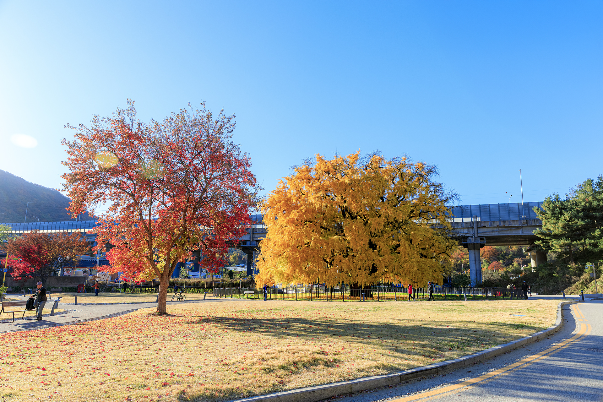 노란 은행잎과 붉은 담풍잎이서로의 이쁨을 자랑하고 있네요