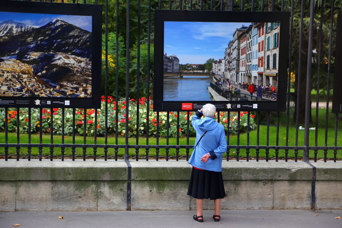 공원  팬스에 전시된 사진을 감상하는 노부인의 모습입니다