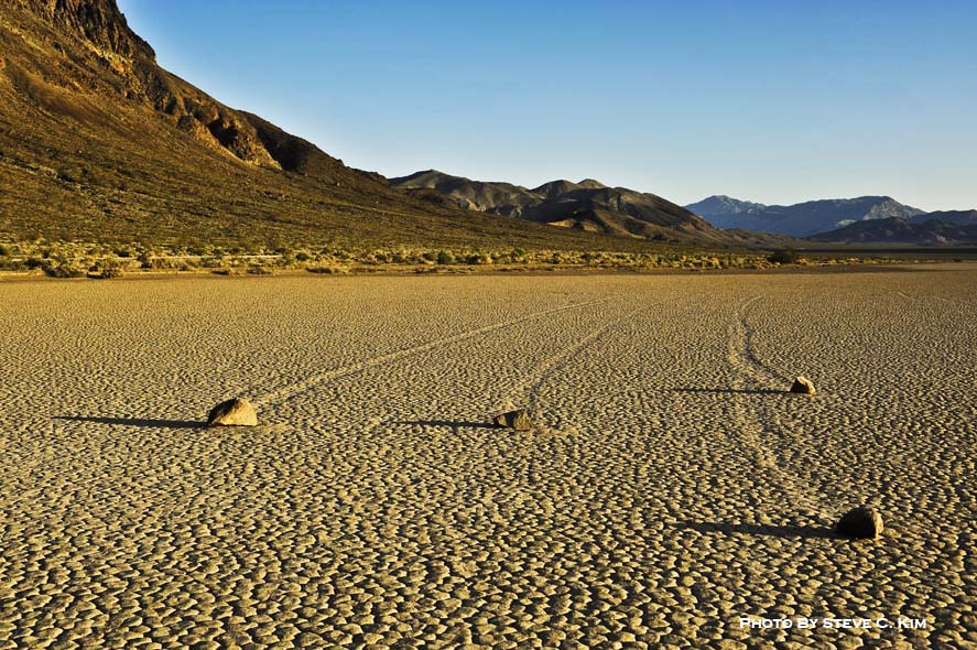 메마른 뻘 위에 돌둘이 서로 빨리 가려고 경주 하듯 남겨진 의문의 자국