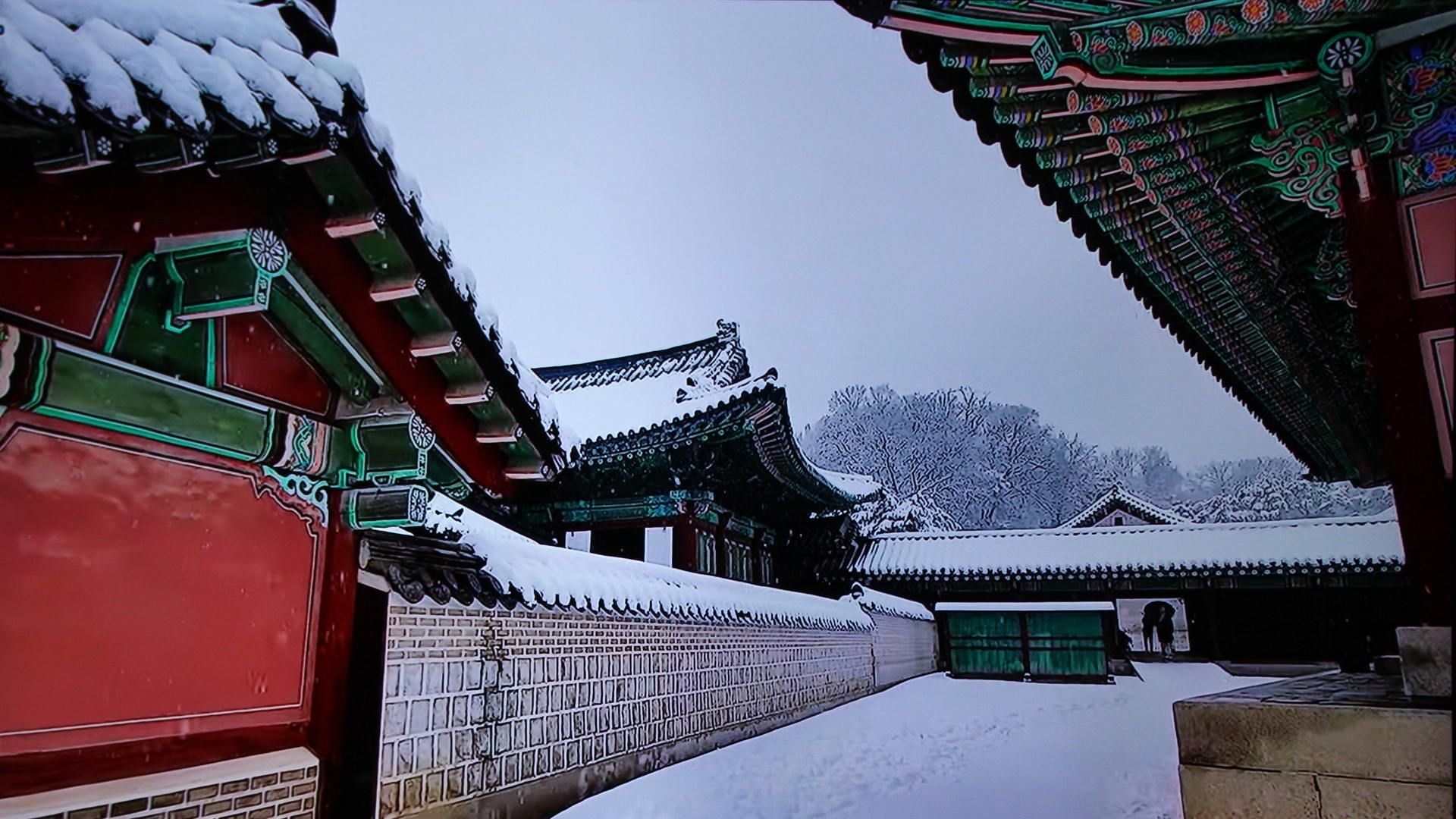 흰 눈에 덮힌 옛 고궁의 화려했던 모습