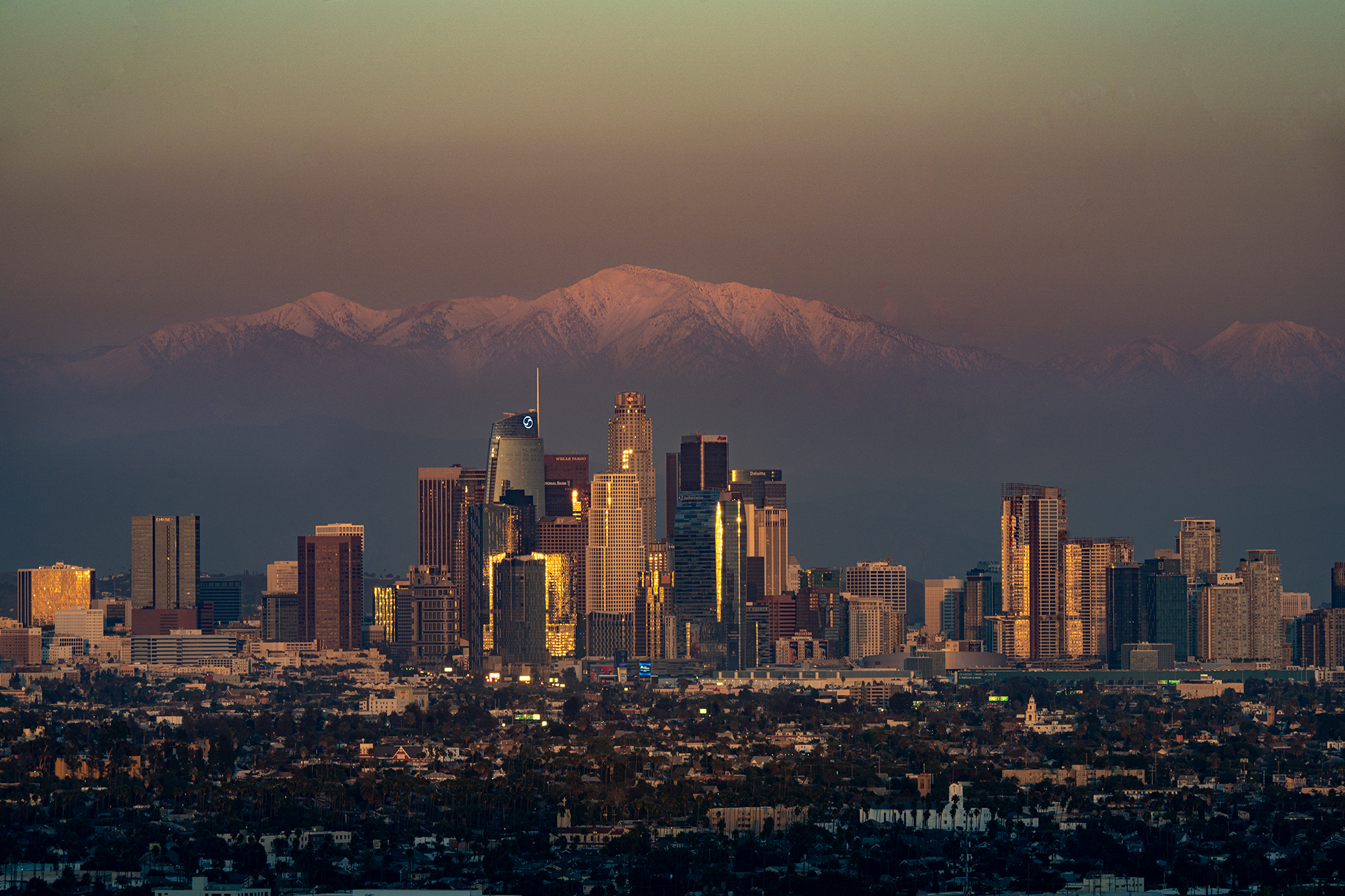 멀리 설산과 LA에 빌딩이 어울린