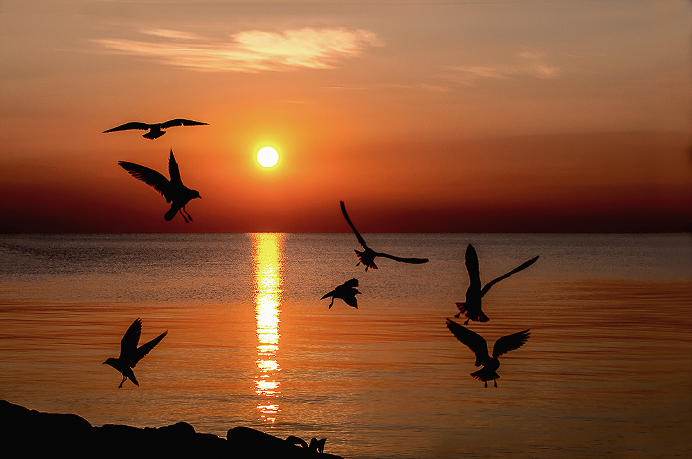 아침 해를 반기는 갈매기들
