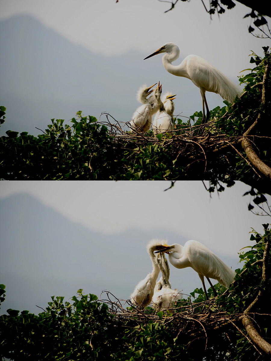 배고픈 새끼들이 어미의 부리를 물고 흔들면