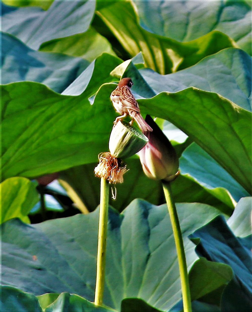 연밥 위에 한가한  참새