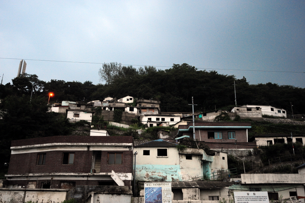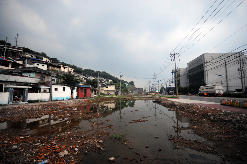 해망동에서 내려와 공터의 빗물에 반영된 해망동 철거촌....반대편의 대로와 새로 지어진 건물이 대조적이다.