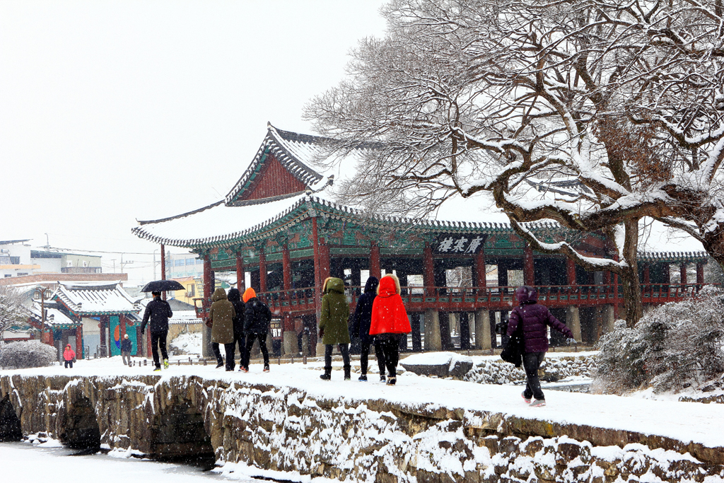 눈 내리는 남원 광한루의 모습입니다.