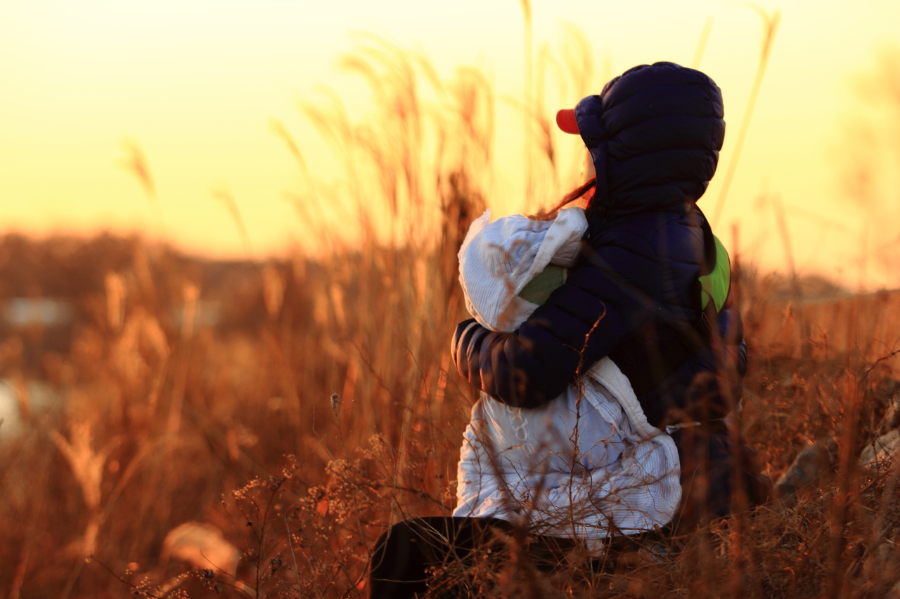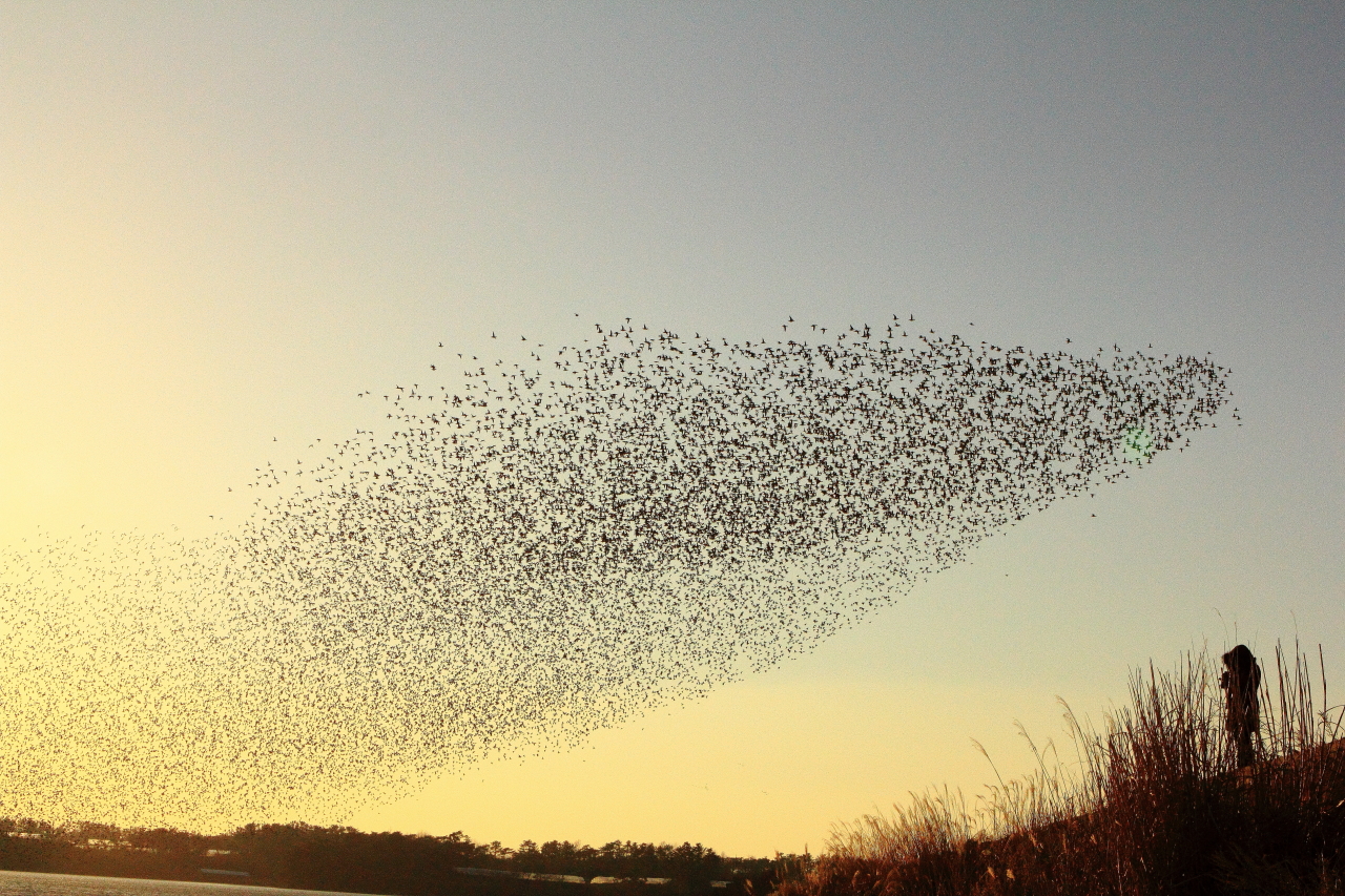 추위에 아랑곳하지 않고 가창오리 멋진 군무을 기다리는 아이와 엄마, 사진가님들.