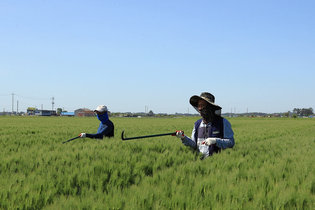 채종포에서 잡초을 제거하는 모습임.