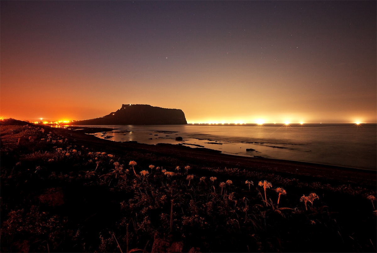 문주란이 피어있는 새벽의 성산일출봉 입니다.