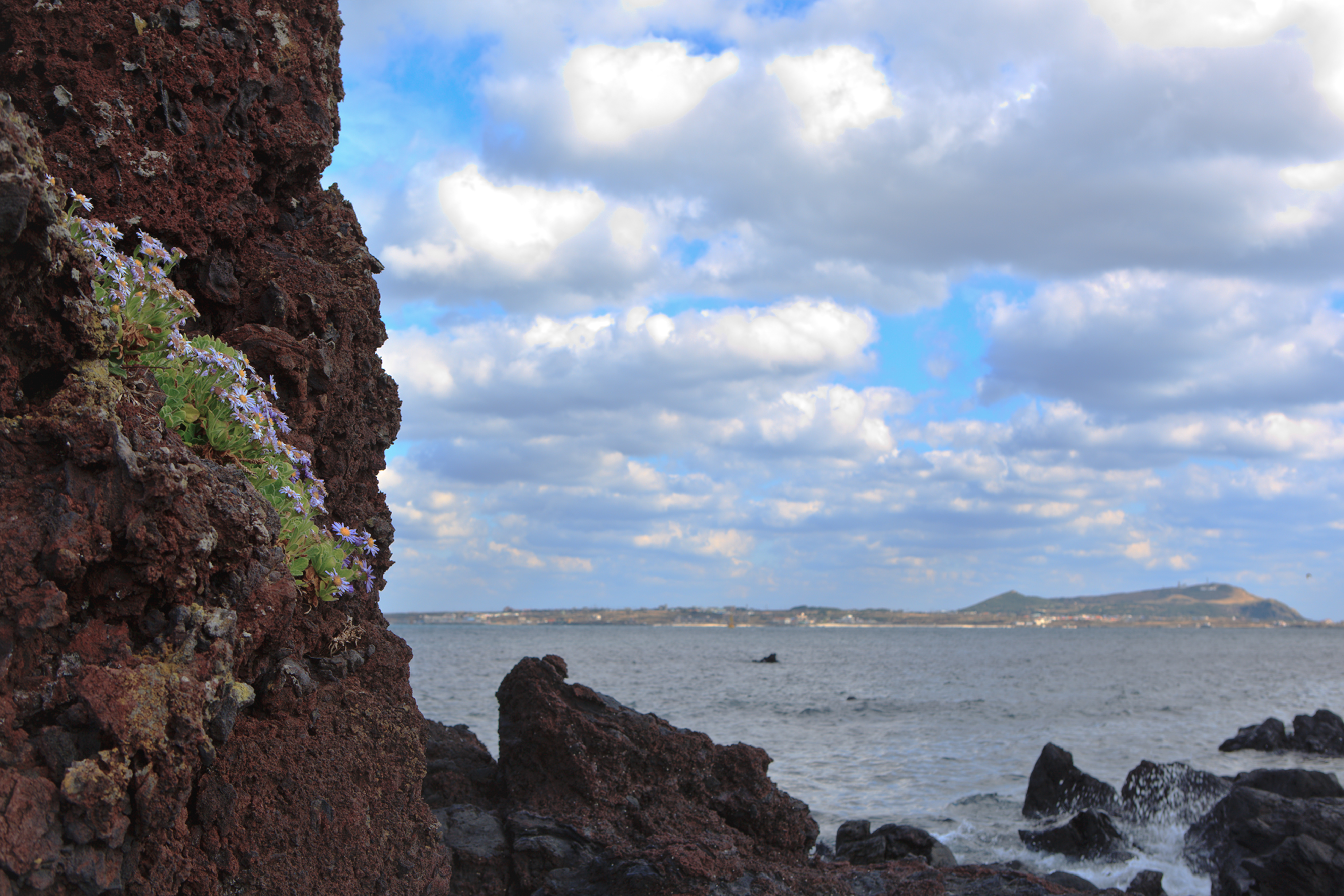 제주도 종달리바다 해국과 우도의 풍경입니다.