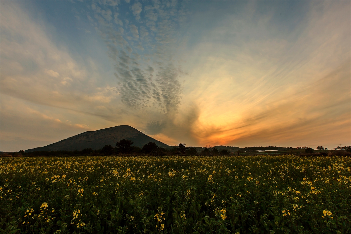 제주 산간에 피어난 유채와 노을빛