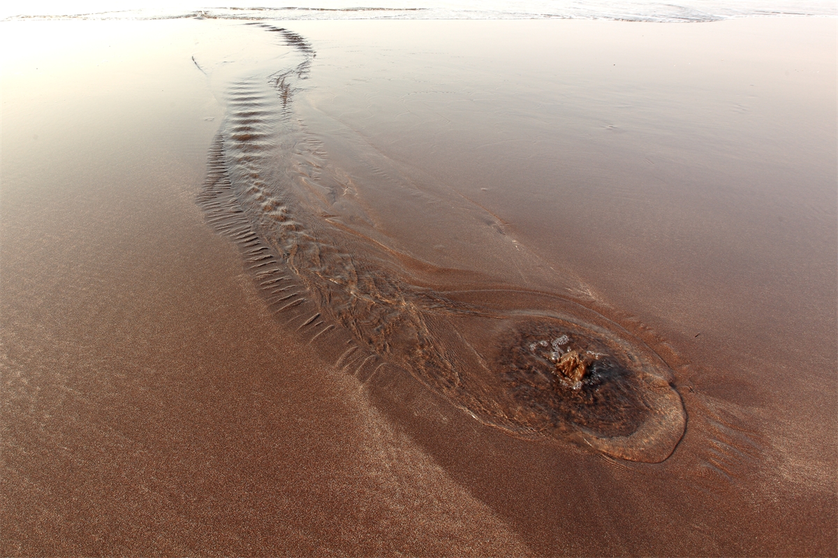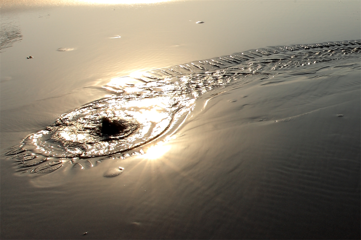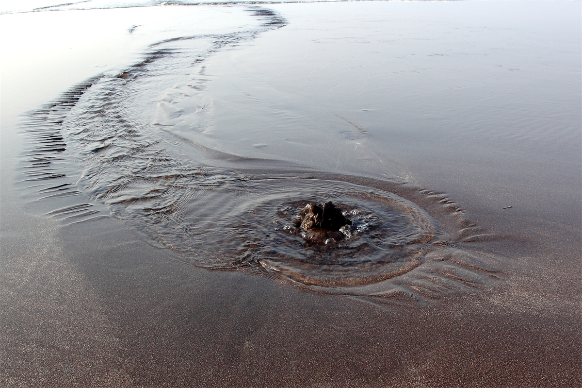 해수욕장 모래사장에 용천수가 흘러가는 모습