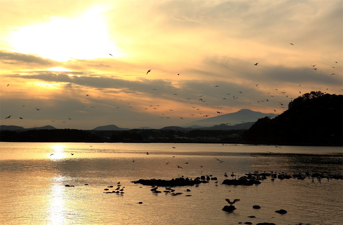 멀리 한라산과 성산포의 바다 노을빛 비취는 터에 갈매기 가족들이 노닌다.