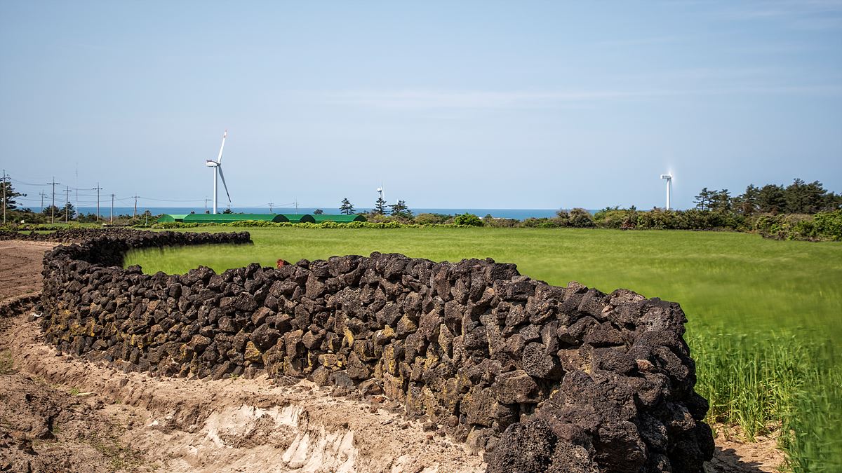 제주의 자연 유산인 돌담과 보리가 있는 풍경