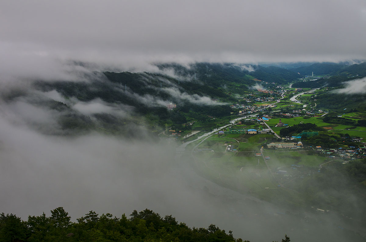 동산에 올라 내리는 안개 속으로~
